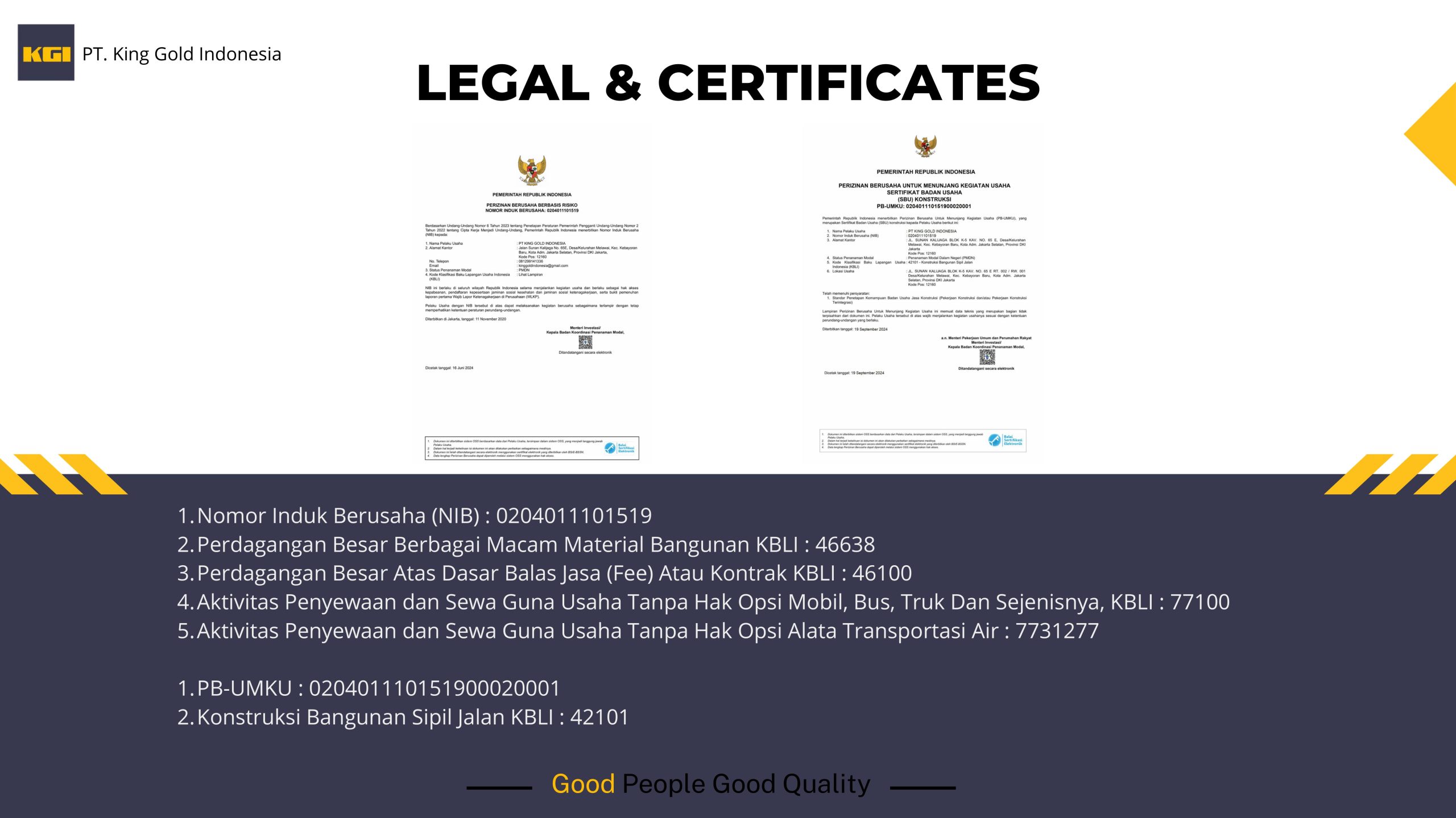 PT King Gold Indonesia is a trading company and general contractor specifically engaged in providing raw and mining materials needs in the domestic market as well as development for the global market. The materials commodities for Port Development, Highway toll road. Building construction, etc include Sandfill, Rubble Rock/Boulder Stone, Split Stone, Base Course A-B, and various other types.